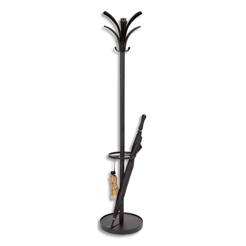 En acier. Base lestée en métal de 5 kg et Ø 38 cm. Tête rotative avec 6 patères en plastique et trois crochets, porte-parapluies, capacité 6 parapluies, coupelle de récupération d’eau. Hauteur : 170 cm.