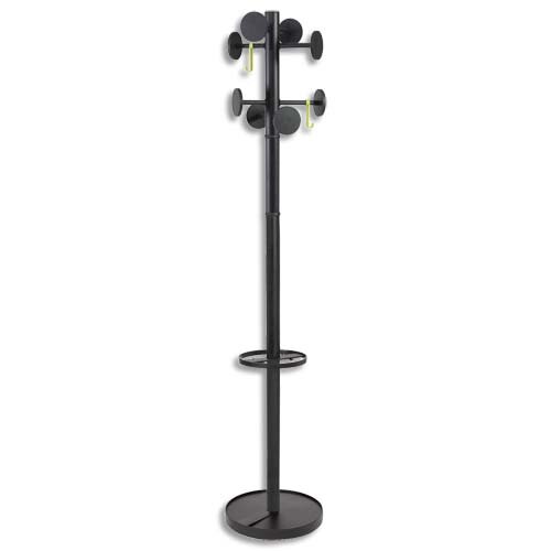 En métal et ABS. Large diamètre : 8 patères ABS et 2 crochets additionnels pour accessoires. Base lestée. Large fût en métal. Porte-parapluies, capacité 7 parapluies. Hauteur : 176 cm. Base : Ø 38 cm.