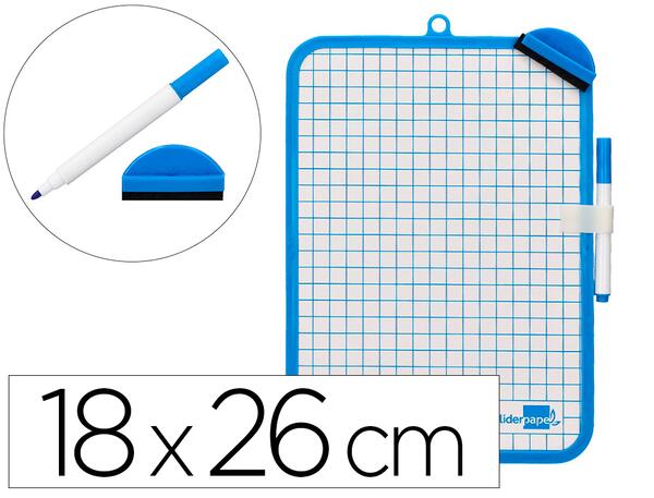 1 face unie et 1 face quadrillée + 1 feutre et 1 effacette magnétiques. Coloris bleu. Dimensions : 180 x 260 mm.