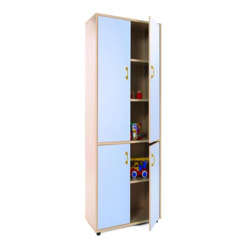 Mobilier bois fabriqué en mélaminé de hêtre. Structure du meuble de 19 mm et fond de meuble de 10 mm d'épaisseur avec chants PVC arrondis de 2 mm. Livré monté mais démontable si besoin. Certifié Tecnalia (norme mobilier infantile et scolaire). Toutes les portes sont montées avec des charnières de sécurité anti pince-doigts pour les meubles concernés. Une personnalisation est possible pour les portes et étagères en utilisant les codes couleur suivants : Préciser le code couleur lors de la commande. Armoire haute 4 portes (épaisseur : 1,6 cm). Poignées en polymère doux (jaunes ou vertes selon la couleur de la porte choisie). Système anti pincement des doigts. 5 étagères. Dim. (L x l x H) : 80 x 40 x 180 cm - L'unité Délai de livraison à partir de 5 semaines.