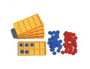 Contenu : 6 boîtes de 10 cases chacune et 60 jetons bleus et 60 jetons rouges