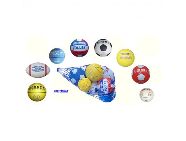 Lot de ballons d'entrainement en caoutchouc. Contenu : 1 ballon basket T3, 1 ballon basket T5, 1 ballon de handball T1, 1 ballon de volley T5, 1 ballon de foot T4, 1 ballon de foot T5, 1 ballon de rugby, 1 ballon tous sport Ø 21 et 1 filet de transport