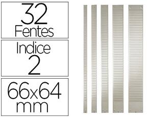 BANDES DE CONSTRUCTION DE PLANNINGS. En métal. Disponible en 2 largeurs : indices 2 ou 3. Disponible en 2 hauteurs : 32 ou 54 fentes. Coloris gris. 64 x 660 mm.