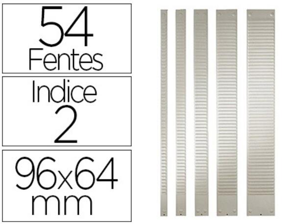 BANDES DE CONSTRUCTION DE PLANNINGS. En métal. Disponible en 2 largeurs : indices 2 ou 3. Disponible en 2 hauteurs : 32 ou 54 fentes. Coloris gris. 64 x 960 mm.
