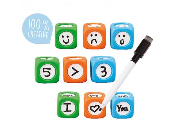 Ensemble de trois dés réécrivables avec un feutre effaçable pour travailler sur toutes sortes de concepts. Contenu : 3 maxi-dés de couleur et 1 marqueur effaçable Dyscalulie - Dyslexie - Dysphasie