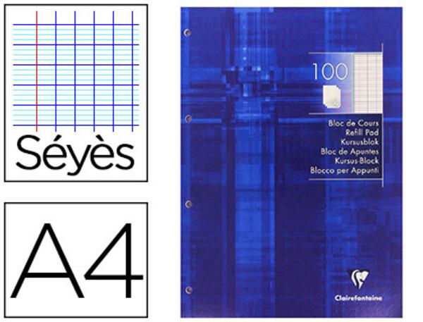 Bloc de 200 pages encollées grand côté A4, détachables, perforées. Papier vélin velouté 90 g/m². Réglure séyès. 4 trous. Dimensions : 210 x 297 mm.