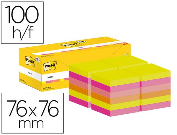 Bloc de 100 feuilles repositionnables. Coloris assortis. Dimensions : 76 x 76 mm. Value-pack de 24 blocs dont 6 gratuits. Produit certifié PEFC et FSC.