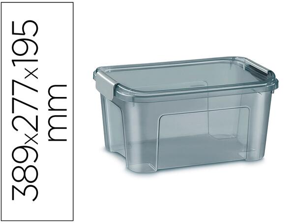 Boîte de rangement fabriquée à partir de matière polypropylène recyclée. Fermeture très résistante par clips. Rebord sur le pourtour pour transporter facilement la boîte. Parfaite protection contre l'humidité, la poussière et l'écrasement. Empilable et superposable. Couleur gris fumé. 100% recyclable.