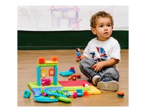 Pièces plastiques coloris et formes (cubes, personnages et roues) assortis, qui s'emboîtent avec une légère pression. Contenu : 85 pièces