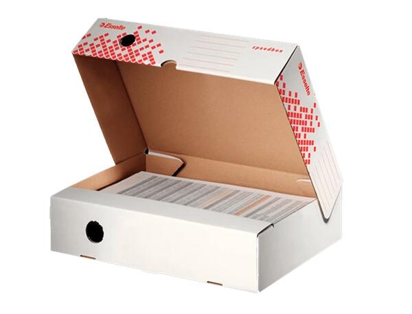 En carton ondulé super rigide. Taille parfaite pour les étagères d'archivage, la boîte peut être positionnée verticalement ou horizontalement. Indexable sur 3 faces. Solide et très facile à monter : une simple pression sur les côtés suffit. Montage automatique. Dos de 80 mm. Livrée à plat. Pour format A4. Coloris blanc. Dimensions : 250 x 350 mm. Produit certifié FSC.