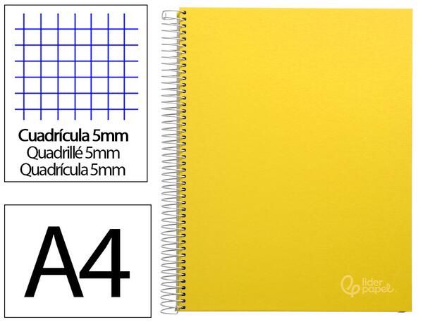 Couverture en carton contrecollé de 1,50 mm d'épaisseur, recouvert sur une face de papier couché brillant de 135 g/m². Couverture intérieure imprimée. Papier de 75 g/m². Microperforé. 280 pages. 4 trous. Bandes de 5 couleurs. Avec marge. Spirale nylonisée de couleur. Coil-lock. Réglure 5 x 5.