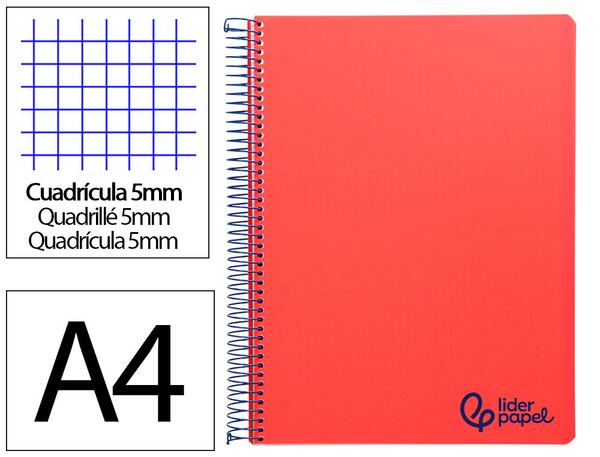 Couverture en polypropylène opaque lisse de 600 microns. Papier de 90 g/m². Spirale de couleur. Micro performation. 5 bandes de couleurs pour les formats A4 et A5, 4 bandes de couleur pour les formats A6 et A7. Avec marge. Coil-lock. Réglure 5 x 5.
