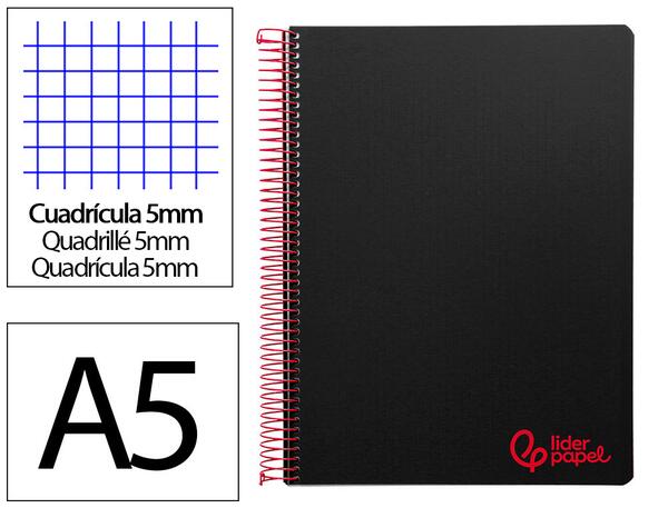 Couverture en polypropylène opaque lisse de 600 microns. Papier de 90 g/m². Spirale de couleur. Micro performation. 5 bandes de couleurs pour les formats A4 et A5, 4 bandes de couleur pour les formats A6 et A7. Avec marge. Coil-lock. Réglure 5 x 5.