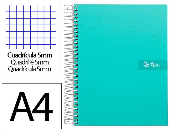 Couverture en carton contrecollé de 1,5 mm d'épaisseur, recouvert sur une face de papier couché mat avec détails en RELIEF 135 g/m². Couverture intérieure imprimée. Papier de 90 g/m² avec bandes de 5 couleurs. 240 pages. Microperforé. Spirale nylonisée de couleur. Coil-lock. Réglure 5 x 5.