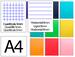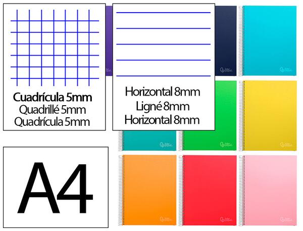 Couverture en carton contrecollé de 1,50 mm d'épaisseur, recouvert sur une faCe de papier couché brillant de 135 g/m². Couverture intérieure imprimée. Papier de 75 g/m². Microperforé. 280 pages. 4 trous. Bandes de 5 couleurs. Avec marge. Spirale nylonisée de couleur. Coil-lock. Réglure 5 x 5.