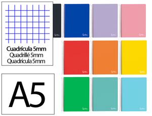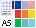 Couverture cartonnée rigide avec plastification mate contrecollée 800g/m2. A5. 240 pages 90g/M2. 5 Bandes de couleur. Microperforé. Spirale blanche. Feuilles avec marge. Réglure 5 x 5 mm. 4 trous pour classer dans un classeur à anneaux. Coloris assortis