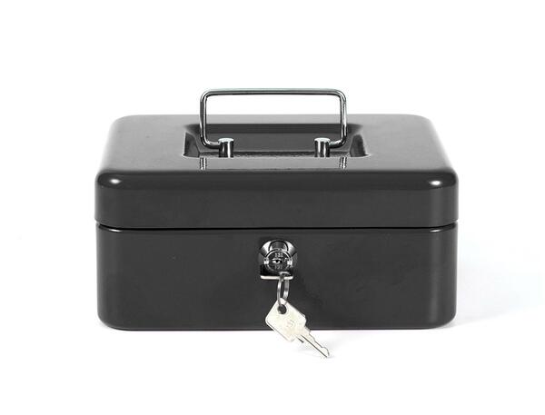 CAISSE À MONNAIE. Structure en acier de 0,8 mm d'épaisseur. 2 jeux de clefs compris. Contient un plateau amovible pour classifier les pièces de monnaie et un espace pour les billets. Noir, 200 x 160 x 90 mm.