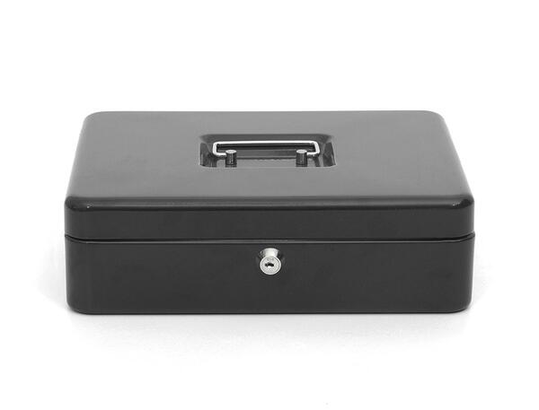 CAISSE À MONNAIE. Structure en acier de 0,8 mm d'épaisseur. 2 jeux de clefs compris. Contient un plateau amovible pour classifier les pièces de monnaie et un espace pour les billets. Noir, 300 x 240 x 90 mm.
