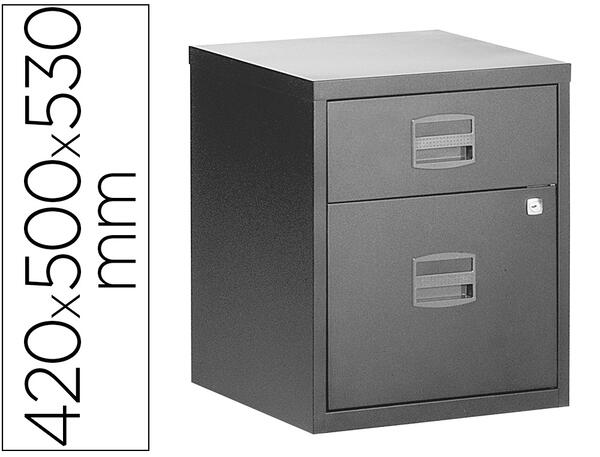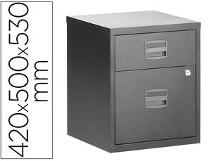 Caisson en métal. Équipé de 4 roulettes + 1 roulette sur le tiroir des dossiers suspendus. Tiroirs coulissants montés sur glissières à billes à extraction 80%. Normes : ISO 9001 et ISO 14001 - CLUB GREEN - GS. Dimensions : 42 x 50 x 53 cm. Anthracite.