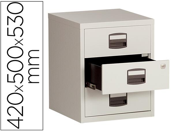 Caisson en métal. Équipé de 4 roulettes + 1 roulette sur le tiroir des dossiers suspendus. Tiroirs coulissants montés sur glissières à billes à extraction 80%. Normes : ISO 9001 et ISO 14001 - CLUB GREEN - GS. Dimensions : 42 x 50 x 53 cm. Gris clair.