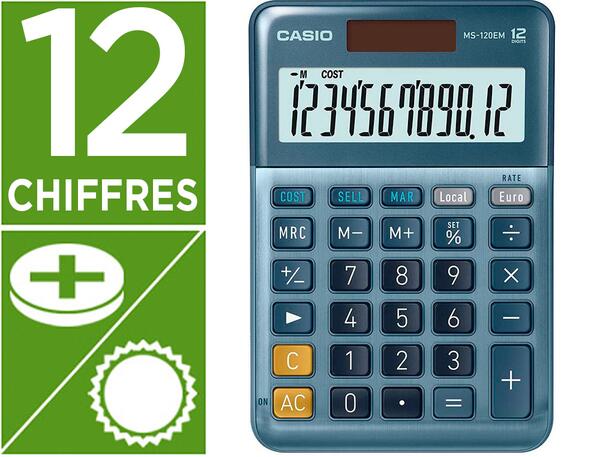 La Calculatrice de Bureau Casio MS120EM est l'outil idéal pour ceux qui ont besoin d'une calculatrice fiable et performante au quotidien. Avec son grand écran et ses multiples fonctionnalités, elle simplifie les tâches de calcul les plus complexes tout en offrant une utilisation conviviale.