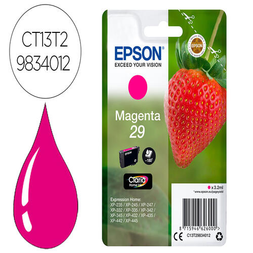 Adoptez la cartouche d'encre Epson Singlepack 29 Claria Home Ink Fresa RF+AM Magenta pour une performance fiable et une qualité d'impression inégalée, parfaitement adaptées aux besoins d'impression domestique. Assurez-vous des résultats optimaux en l'associant avec les papiers d'impression recommandés par Epson.