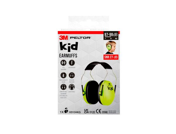 Casque antibruit PELTOR' Kid H510AK, conçu pour les jeunes de plus de 5 ans. Réglable, léger et doté de coussinets larges et souples. Contribue à réduire les niveaux de bruit jusqu'à 27 dB, testé conformément à la norme EN 352:2020. Coloris vert néon.