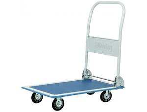 Charge utile 150 kg. Dimensions du plateau : 73 x 47 cm, hauteur du dossier rabattable : 83 cm, 2 roues fixes et 2 roues pivotantes (Ø 10 cm), plateau recouvert d'un tapis antidérapant, pare-chocs de protection. Le chariot 1 plateau