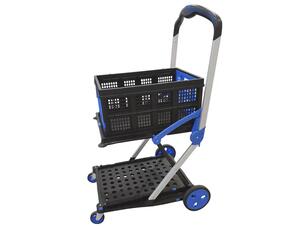 Chariot entièrement pliable muni de 2 tablettes. Ces roues (dont 2 pivotantes) sont rabattables pour un encombrement minimal et un stockage facile. Il est fourni avec un bac pliant d'une capacité de 30 L. Le bac vient se fixer au plateau grâce à de petits ergots. La tablette supérieure peut être rabattue pour transporter des objets plus volumineux. Capacité de charge de 20 à 40 kg sur le plateau supérieur et de 50 kg sur le plateau inférieur.