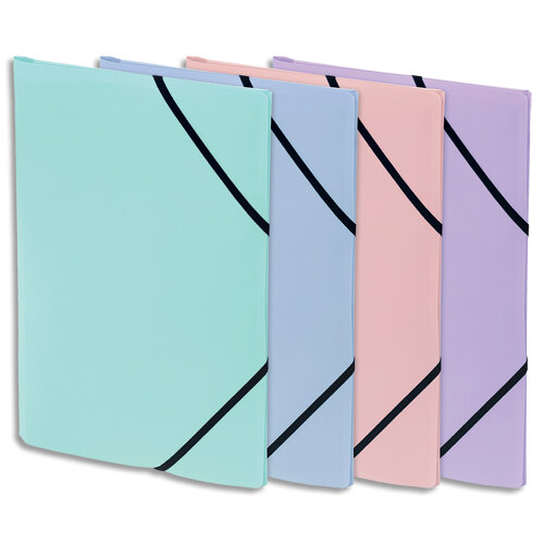 En polypropylène 4/10e. Dos de 1,5 cm. Fermeture par élastique coulissant fixé en 4ème de couverture. Coloris assortis opaques pastel : bleu, vert, mauve, rose. Dimensions : 24 x 32 cm. Pour format A4.