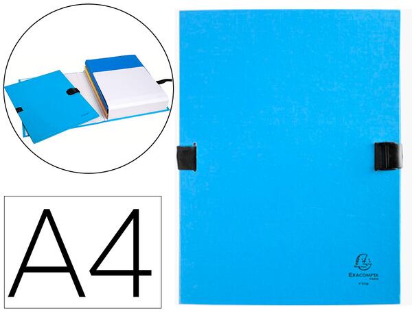 En papier toilé. 1 rabat en papier pour le bon maintien des documents. Fermeture par sangle à clip. Dos extensible jusqu'à 120 mm. Pour format A4. Dimensions : 240 x 320 mm. Coloris: Bleu.