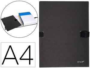 En papier toilé. 1 rabat en papier pour le bon maintien des documents. Fermeture par sangle à clip. Dos extensible jusqu'à 120 mm. Pour format A4. Dimensions : 240 x 320 mm. Coloris: Noir.