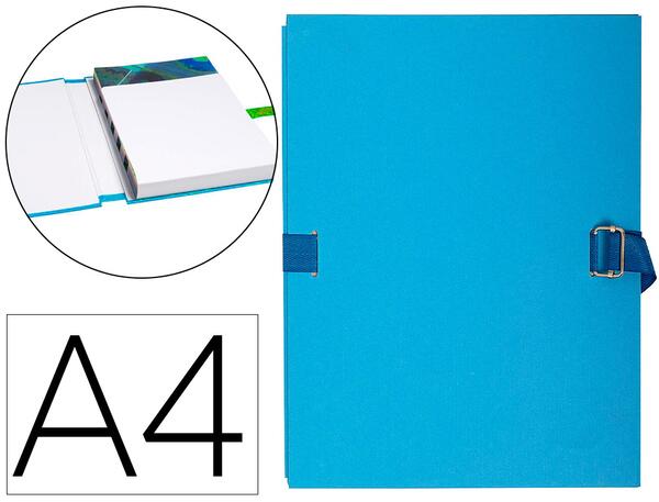 En carton recouvert de papier 1 mm. Intérieur papier blanc. Rabat rainé en pied. Fermeture par sangle et boucle à coulisseau cranté. Dos extensible jusqu'à 130 mm. Pour format A4. Dimensions : 240 x 320 mm. Produit certifié FSC.