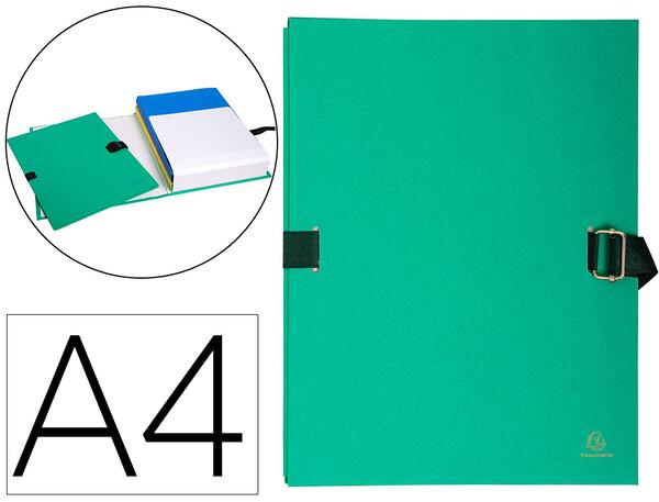 En carton recouvert de papier 1 mm. Intérieur papier blanc. Rabat rainé en pied. Fermeture par sangle et boucle à coulisseau cranté. Dos extensible jusqu'à 130 mm. Pour format A4. Dimensions : 240 x 320 mm. Certifié FSC. Coloris: Vert clair.