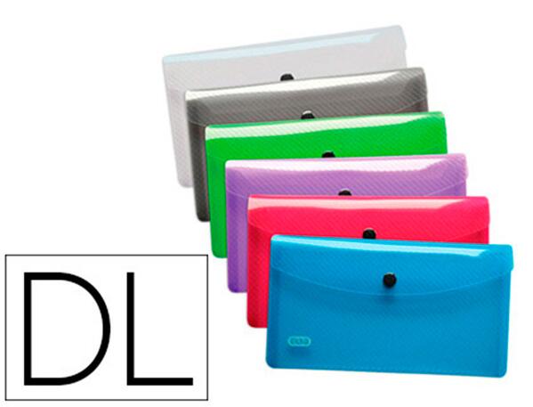 En polypropylène translucide, avec grain ligné. Fermeture par bouton pression, résistance aux taches et à l'eau. Coloris assortis : rouge, gris, bleu, vert et violet. Format DL (120 x 220 mm) - La pochette