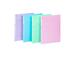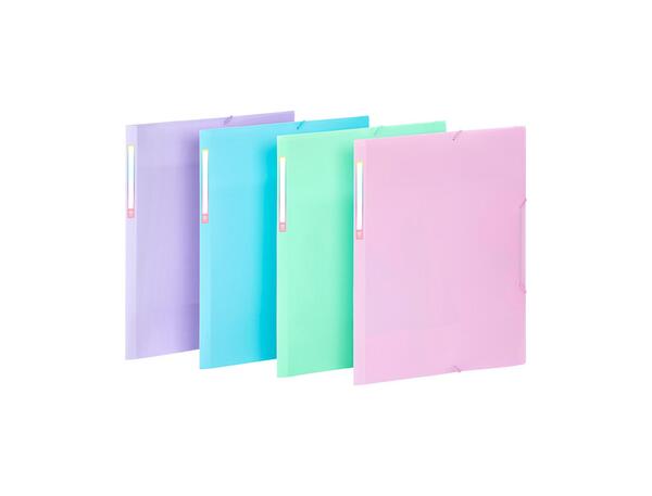 Dimensions : 32,5X43,5CM. Polypropylène opaque pastel 5/10è. Fermeture élastiques ronds de couleurs assorties. Avec étiquette tranche. Carton présentoir. Coloris : Bleu - Rose - Vert - Violet