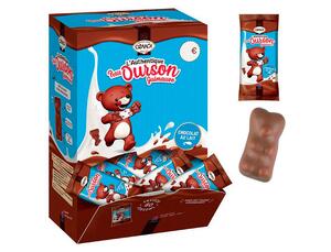 Oursons de guimauve enrobée de chocolat en sachets individuels. Boîte distributrice de 80 oursons.