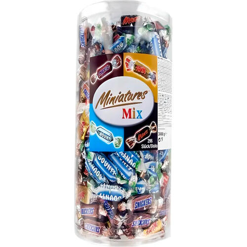 Barres de 10 g. Bounty, Mars, Snickers et Twix. Tubo de 296 barres.