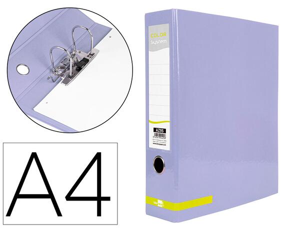 Classeur fabriqué en carton recouvert de plastique de 1,9 mm d'épaisseur. Mécanisme à levier de 75 mm avec anneau et compresseur métallique. Largeur de dos: 80 mm. Format Din A4. Couleur Lavande. Mesures: 318 x 285 mm.