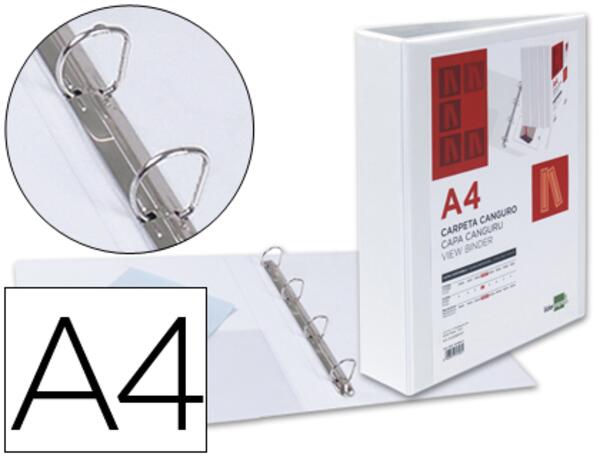Classeur personnalisable fabriqué en carte de 2,2 mm, recouvert en PVC. Pochette transparente soudée à l'intérieur. Pochette extérieure sur couverture et dos pour une personnalisation complète 3 faces. Anneaux mixtes. Compresseur métallique. Pour format A4. Dimensions : 283 x 320 mm. Coloris blanc.