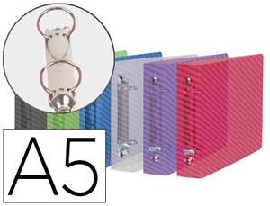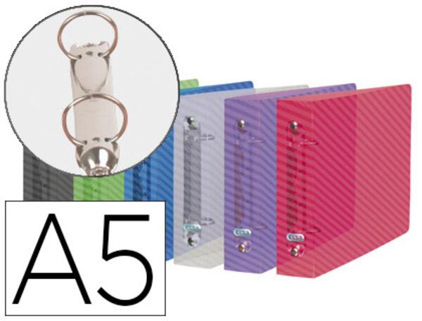 Épaisseur 7/10ème. 2 anneaux de 25 mm. Dos de 30 mm. Capacité : 200 feuilles. Coloris assortis : incolore, gris, rouge, violet et bleu. Pour format A5 à l'italienne. Dimensions : 240 x 160 mm.