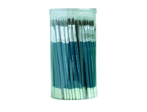 Pinceaux et brosses en poil de poney extra doux. Le classpack se compose de 24 pinceaux ronds par taille : n°4, n°8, n°12 - 24 brosses plates par taille : n°6, n°8, n°10. Manches en bois et viroles en alu. Lot de 144 pièces assorties