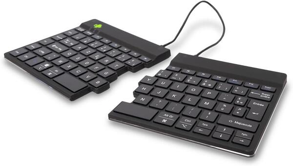 1. Clavier ergonomique R-Go Split Break V2 avec logiciel de pause, ultra-mince, AZERTY (FR), non Filaire , rechargeable. noir 2. Touches de raccourcis: Copier, coller etc Aimanté . Ce clavier séparé permet d'éviter que les poignets ne se tordent pendant la frappe. Taper avec les poignets droits réduit la tension musculaire et évite le pincement des tendons et des vaisseaux sanguins. L'aimant intégré vous permet de transformer les deux parties séparées du clavier en un clavier compact en un seul geste. Bluetooth et rechargeable pour 150 h de travail. Grâce à sa taille compacte, la souris est toujours à portée de main. La légèreté de la frappe permet de réduire au minimum la tension musculaire lors de la frappe. Le clavier est plat, ce qui permet à vos mains et à vos poignets de rester à plat et détendus pendant la frappe. Les signaux de couleur LED du clavier indiquent si vous travaillez sainement et s'il est temps de faire une pause. Au fur et à mesure que vous tapez, la lumi