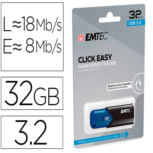 Découvrez la clé USB EMTEC 3.2 B110 Click Easy de 32 Go, un dispositif de stockage portable alliant performance et design élégant. Avec une vitesse de transfert deux fois supérieure à celle des clés USB 2.0, elle est idéale pour ceux qui ont besoin de déplacer rapidement de gros fichiers. Son style noir avec une touche de couleur bleue ajoute une touche moderne à cet accessoire pratique.