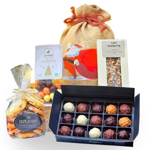 Présentée dans une hotte en toile de jute au décor de Noël, cette composition élégante réunit le meilleur de la chocolaterie artisanale française. Un cadeau aussi généreux que raffiné.
