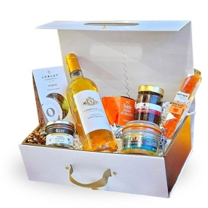 Le tout est soigneusement disposé dans un coffret rouge orné de motifs de Noël et agrémenté d’un ruban blanc. Une sélection festive et raffinée, parfaite pour éveiller les papilles des amateurs de délices gourmands.