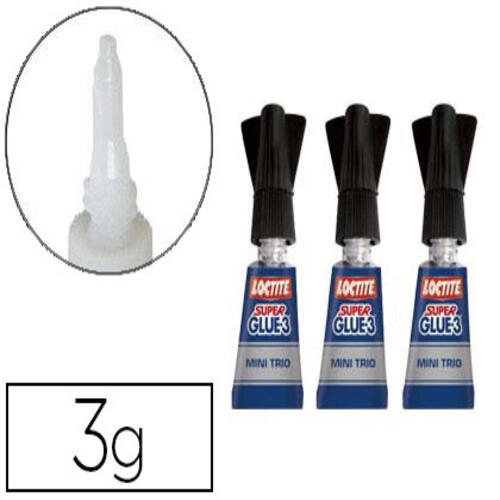 Colle SUPER GLUE 3 mini trio. Colle cyanoacrylate super puissante. Formule liquide. Séchage ultra rapide en quelques secondes. Multimatériaux. Mini tubes de 1 g. Blister de 3 mini tubes.
