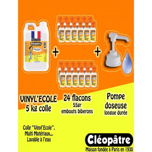 La colle vinylique Cléopâtre Vinyl École Rapide Multi Matériaux est une colle blanche spécialement conçue pour un usage scolaire et artisanal. Sa formule sans solvant garantit un usage plus sûr, notamment pour les enfants, tout en offrant un collage rapide et efficace sur une variété de matériaux. Ce pack complet de 24 flacons de 55 g, accompagné d'un bidon de 5 kg et d'une pompe doseuse, est idéal pour les établissements scolaires ou les ateliers de loisirs créatifs.