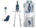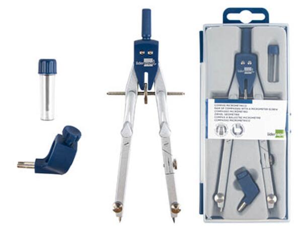 Compas micrométrique avec vis et touche de réglage rapide. Étui de mines de 2 mm et bague universelle. Articulé sur les deux branches. Longueur : 170 mm. Diamètre de circonférence jusqu'à 380 mm. Présenté dans un étui en plastique.