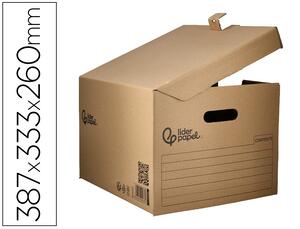 Boîte conteneur d'archivage. Idéal pour stocker des documents, des dossiers et des archives définitives. Montage manuel simple et rapide sans besoin de ruban ou d'adhésifs. La boîte a un code QR qui redirige vers une vidéo avec les instructions de montage. Avec couvercle fixe et fermeture à languette pour plus de sécurité et de résistance. Elle a des poignées sur les côtés pour que vous puissiez la transporter de manière confortable et sécurisée. Avec zone d'étiquetage pour identifier les fichiers ou objets stockés à l'intérieur. Cette boîte conteneur a une capacité de 3 boîtes d'archivage définitives au format folio ou 3 classeurs A-Z. Cette boîte conteneur de couleur kraft est fabriqué en carton 100% recyclé et recyclable. Les dimensions de la boîte sont 387x333x260 mm. Carton de 512 g/m².